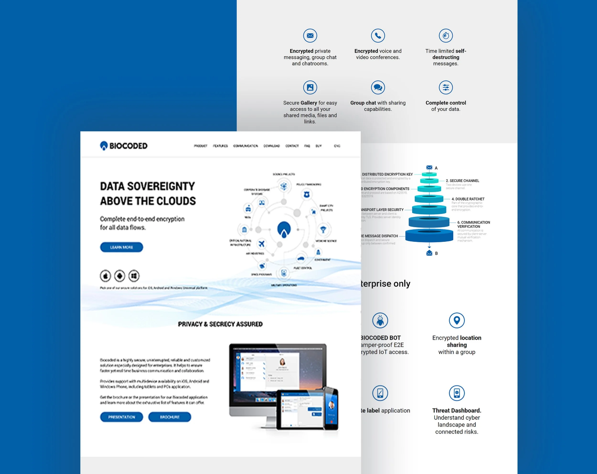 Additionally, I was working on redesigning the Biocoded webpage as well. The main focus on the webpage is the Biocoded product, which is an end-to-end encrypted voice call and messaging app. It is available as a free cloud service for end users and as a licensed self-hosted server installation for complete in-house privacy.